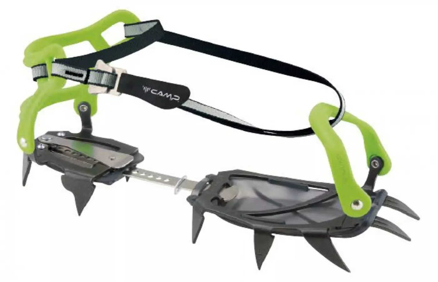 Zwei breite Frontalzacken garantieren eine gute Tragfähigkeit auf Schnee, während querstehende Zacken für Stabilität beim Abstieg sorgen. Der Verbindungssteg lässt sich je nach Steifigkeit halbstarr oder flexibel einstellen.